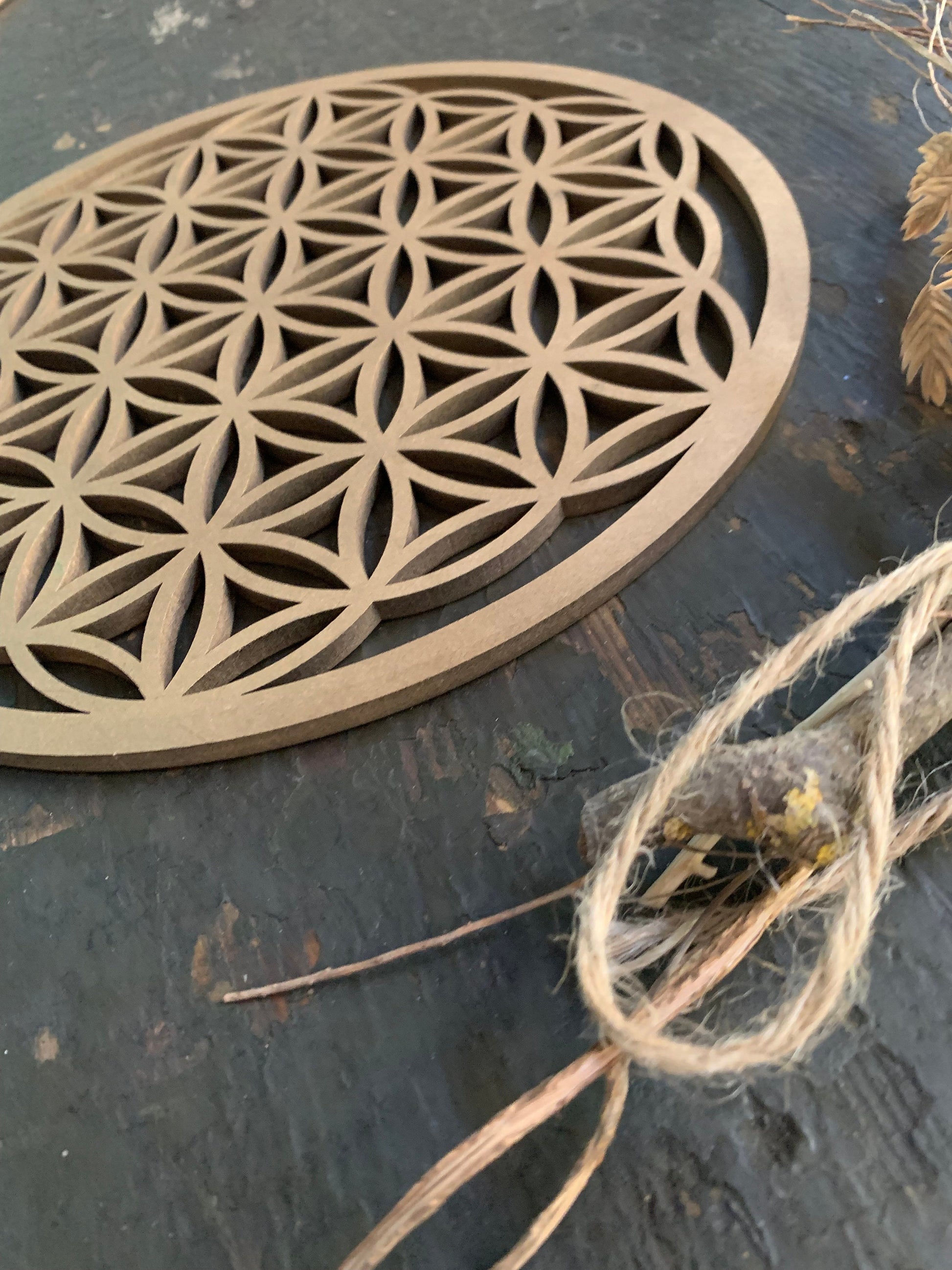 Die Blume des Lebens wird mittels Laser geschnitten, demnach wird sie ein paar Tage nach verbranntem Holz / Lagerfeuer riechen.