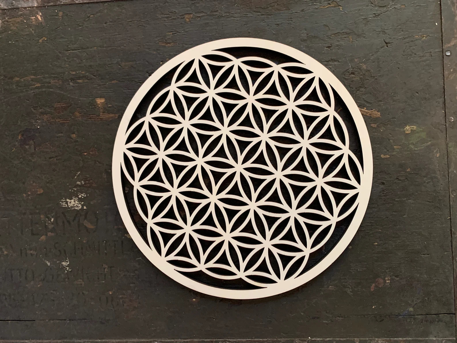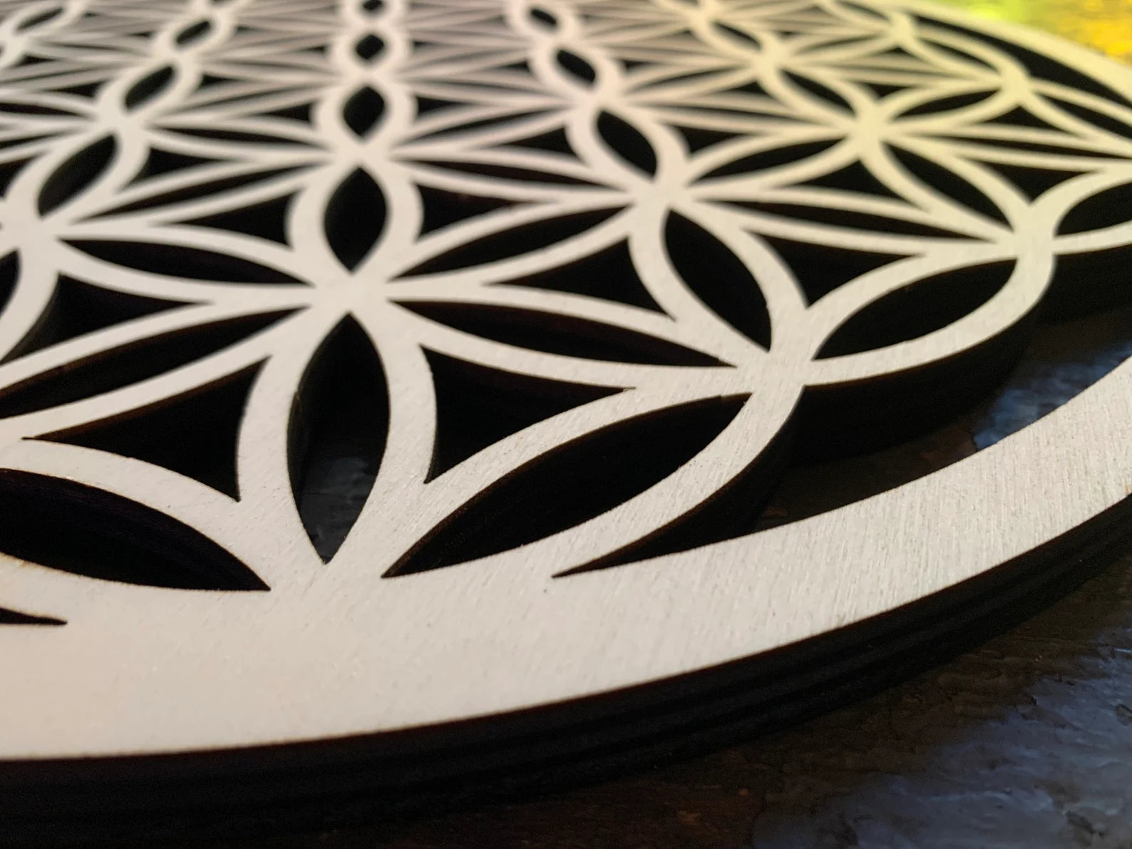 Die Blume des Lebens wird mittels Laser geschnitten, demnach wird sie ein paar Tage nach verbranntem Holz / Lagerfeuer riechen.