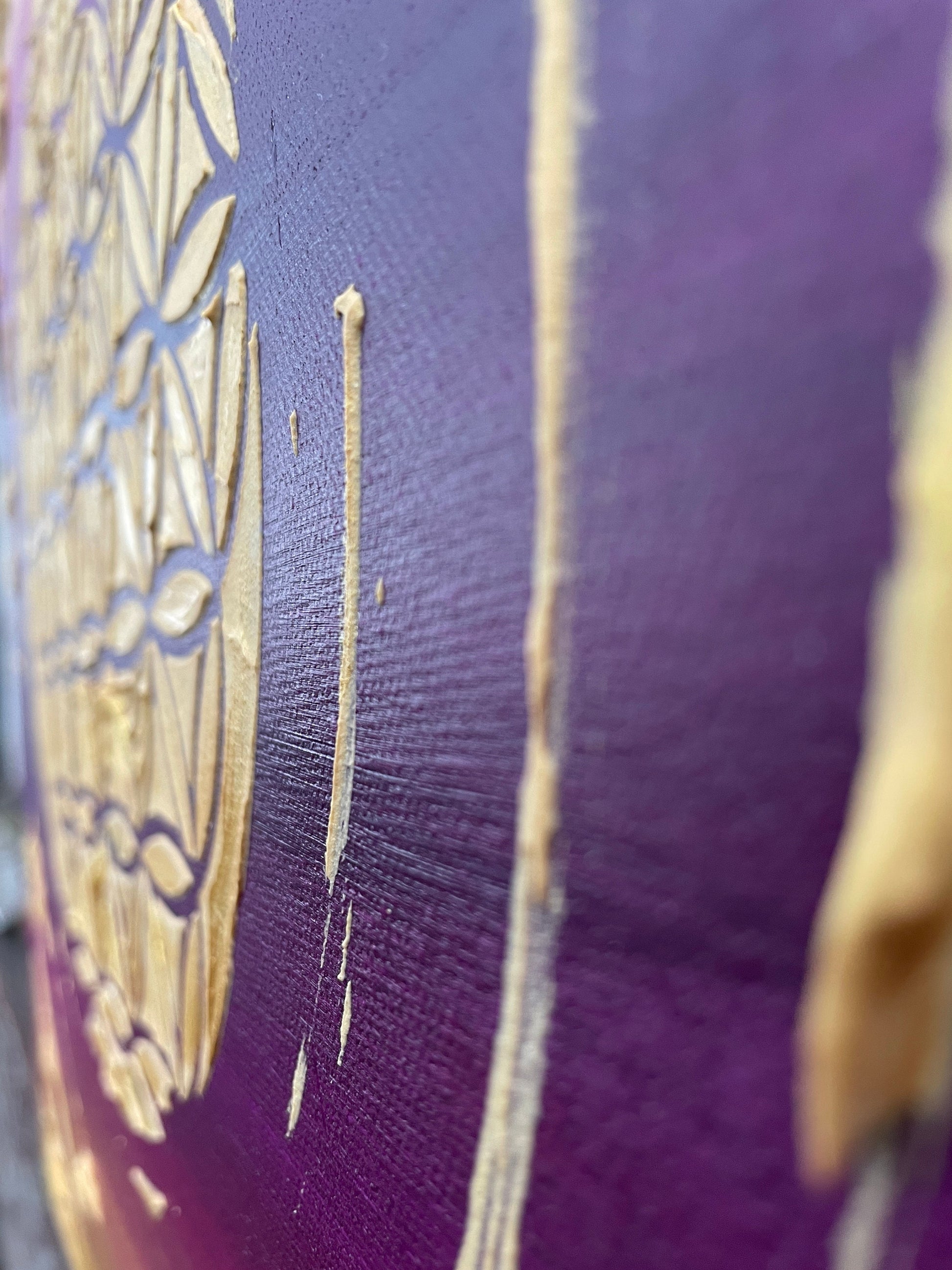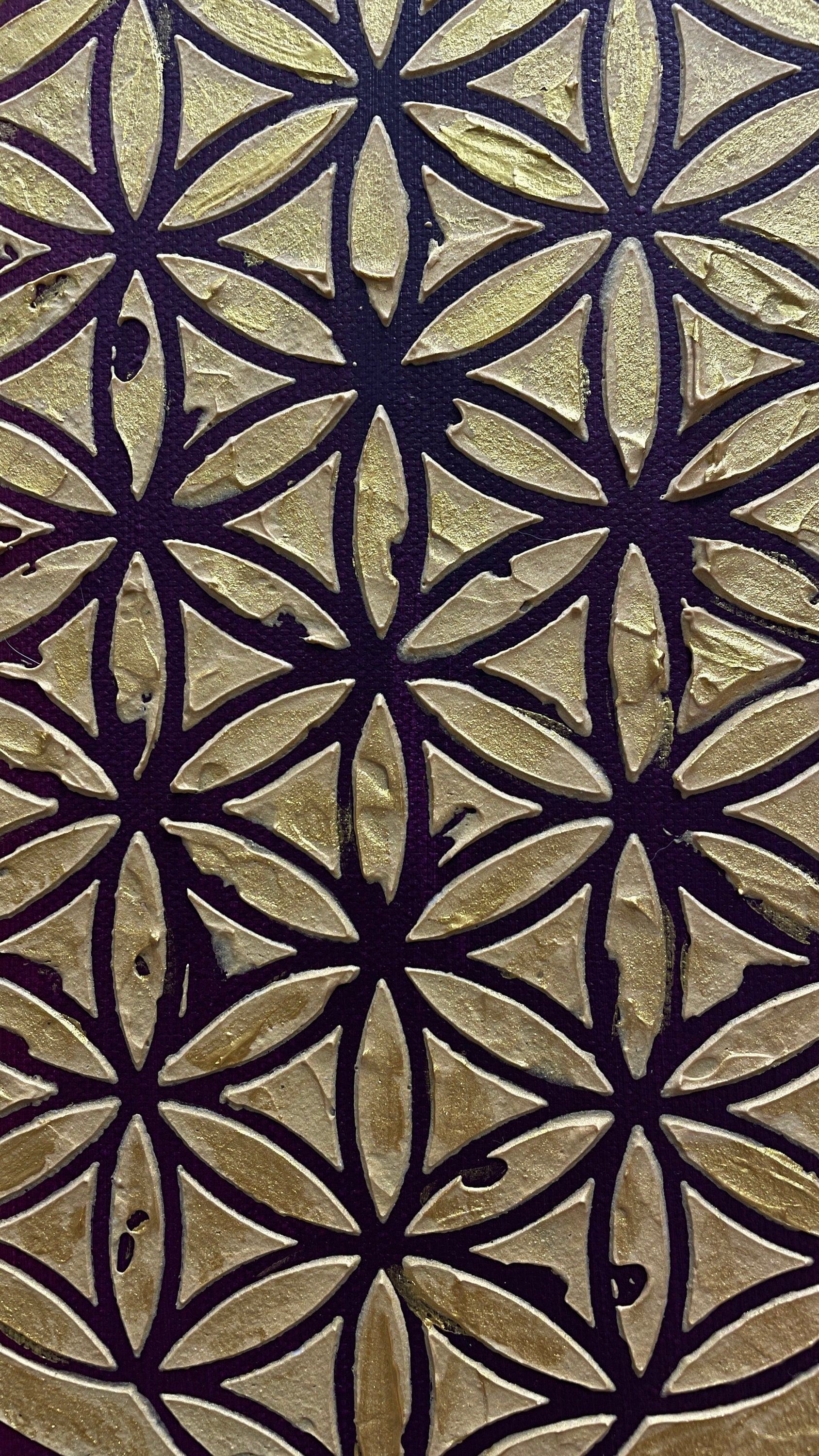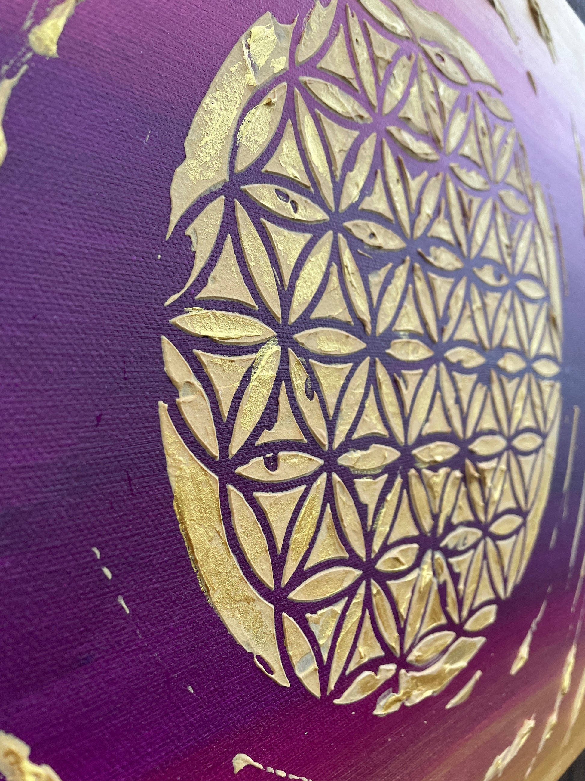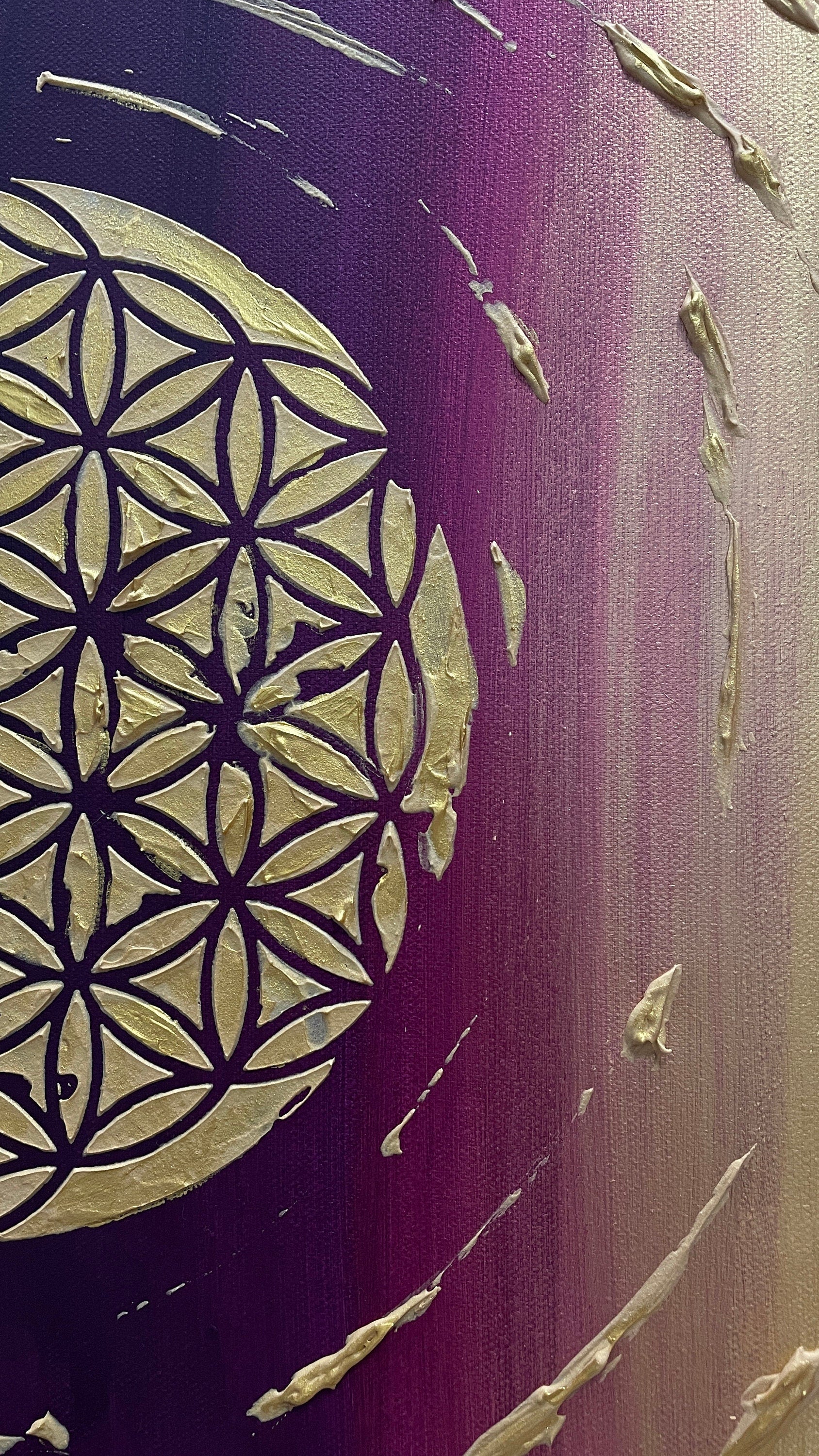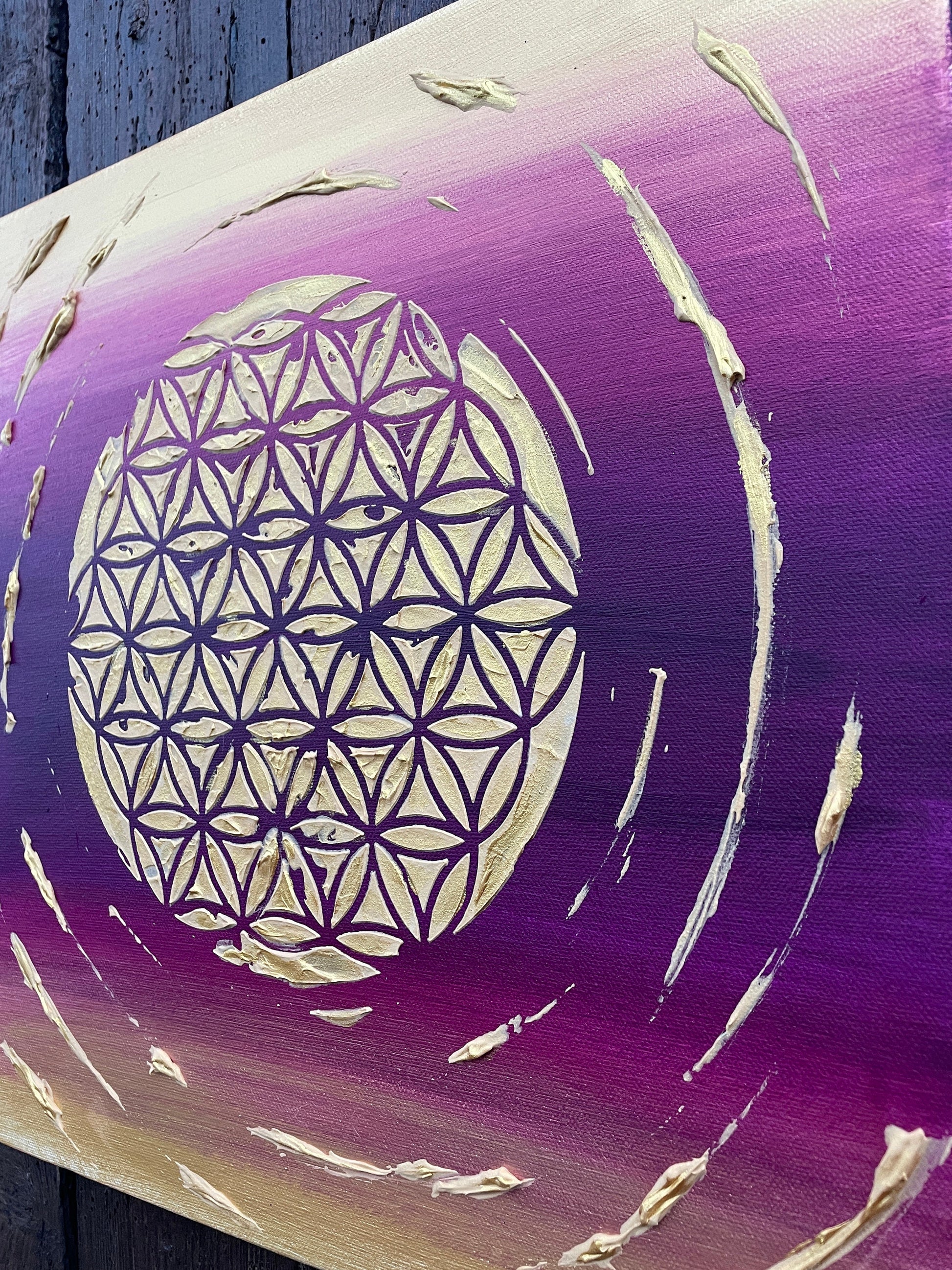 Das Bild selbst ist eine Kombination aus Struktur und Glanz, die das Auge und die Sinne anspricht. Die Strukturpaste gibt dem Bild eine dreidimensionale Qualität, die die Blume des Lebens in den Vordergrund rückt und ihre Schönheit betont. Das Gold, das auf dem Bild verwendet wurde, verleiht dem Bild einen Hauch von Luxus und Eleganz, während das Violett die Farbe der Spiritualität und Kreativität ist.