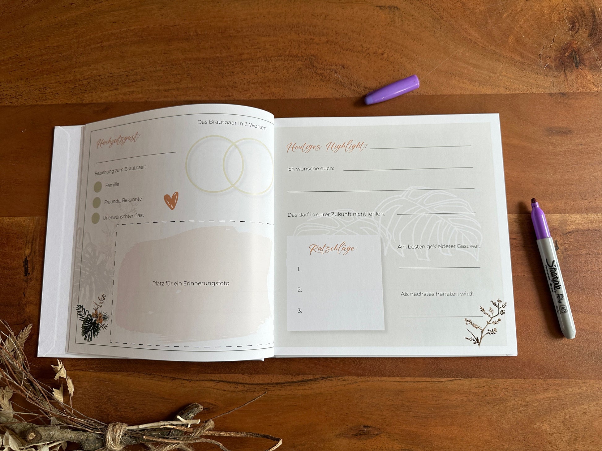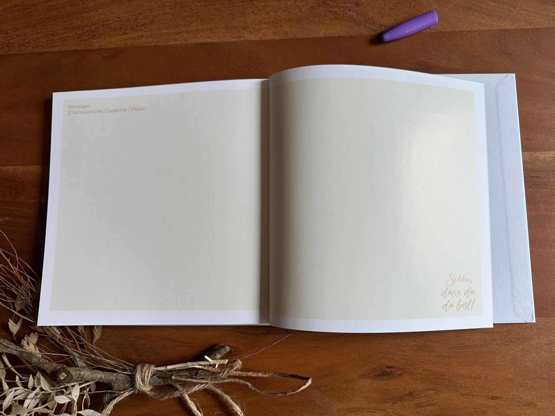 Im Innenteil befindet sich eine kurze Einleitung und 2 verschiedene Doppelseiten für die Gäste zum Ausfüllen. Man kann auch direkt ein Foto an die passende Stelle einkleben.