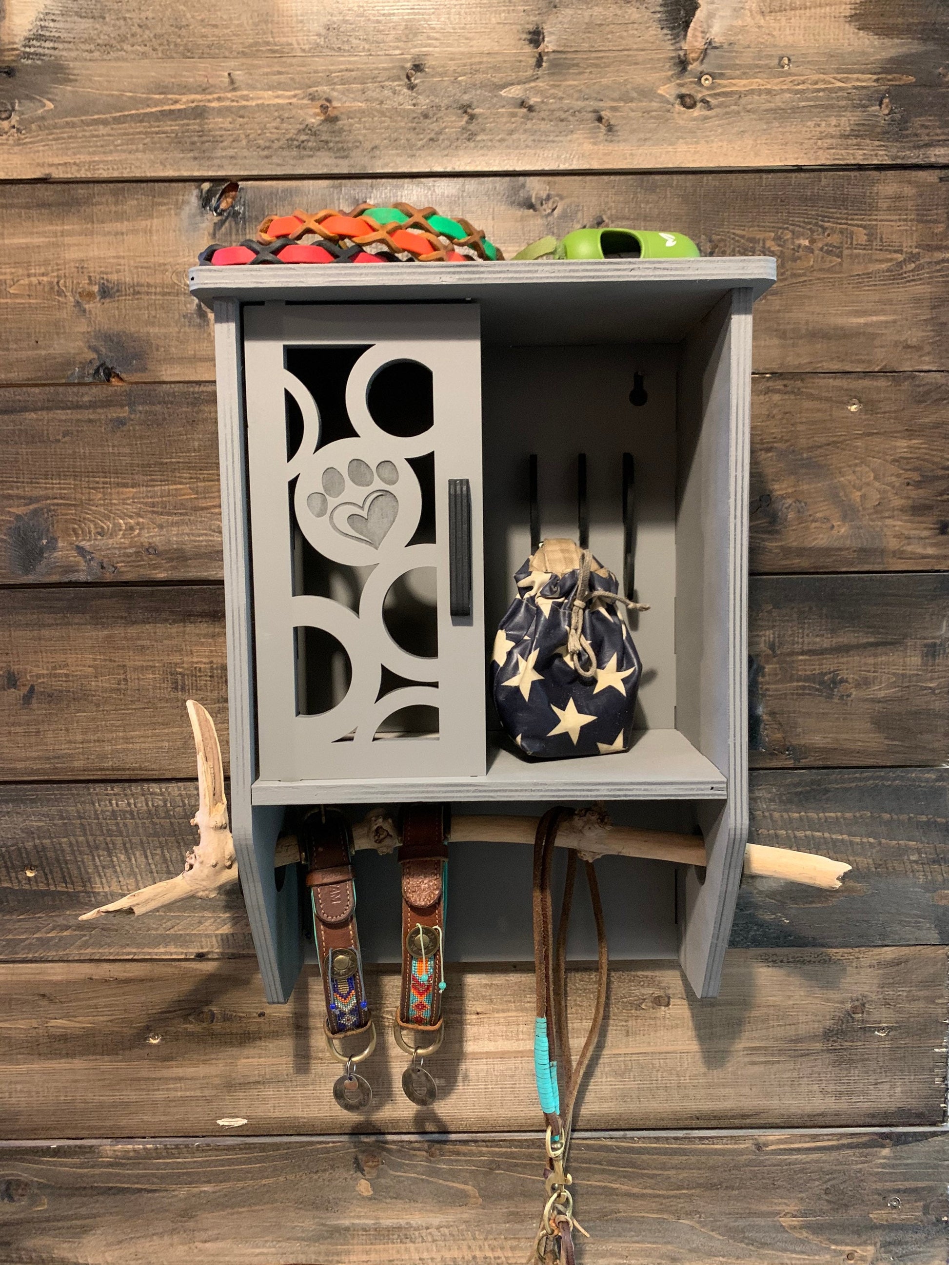 Jetzt mit praktischer Aufhängung in Form eines Treibholz Stocks, diese sorgen endlich für Ordnung im Leinenchaos. Hier kann man Leinen, Geschirre, Leckerlibeutel, Handtücher Schietbeutel etc. aufhängen und spart sich somit die ewige Sucherei.
