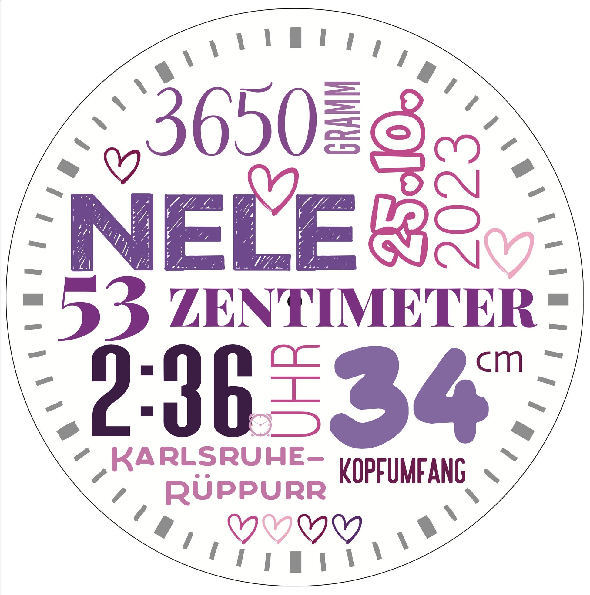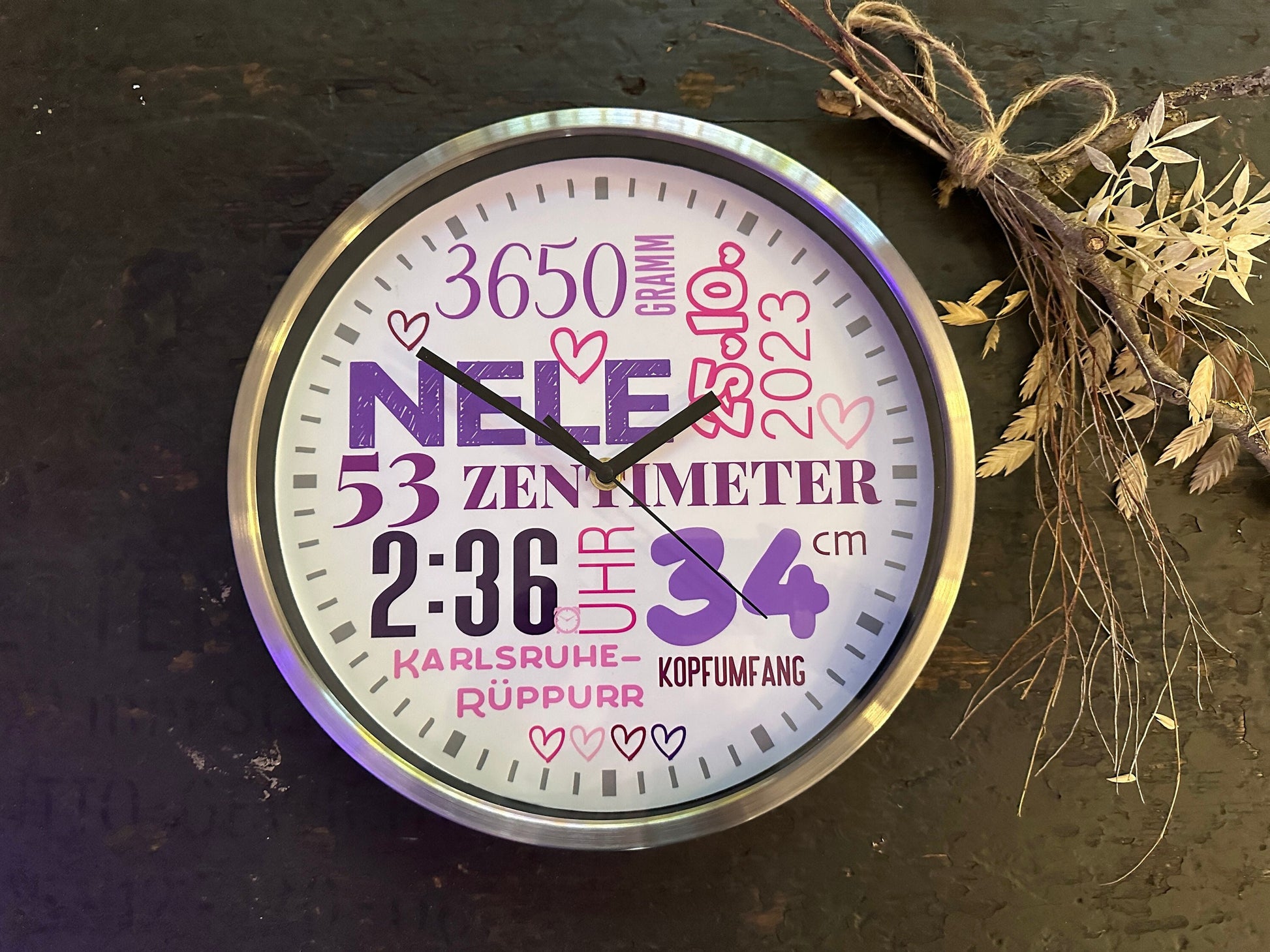 Liebevoll gestalteten wir die Wanduhr mit Wunschnamen und Geburtsdaten