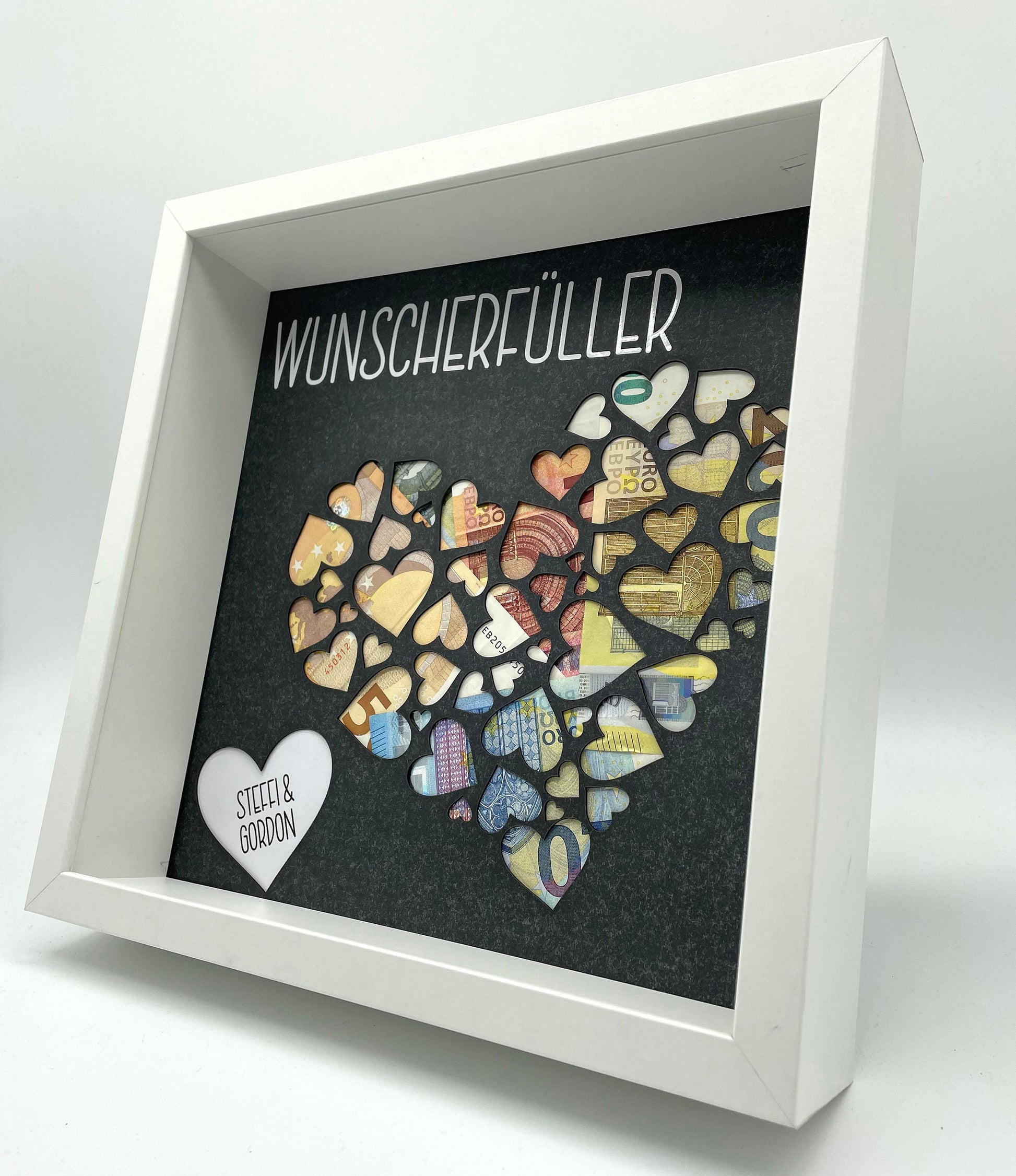 Du bestimmst selber, wie das Herz aussehen wird indem Du zB Deine Geldscheine dahinter legst. Aber Du kannst es natürlich auch ganz anders Dekorieren.