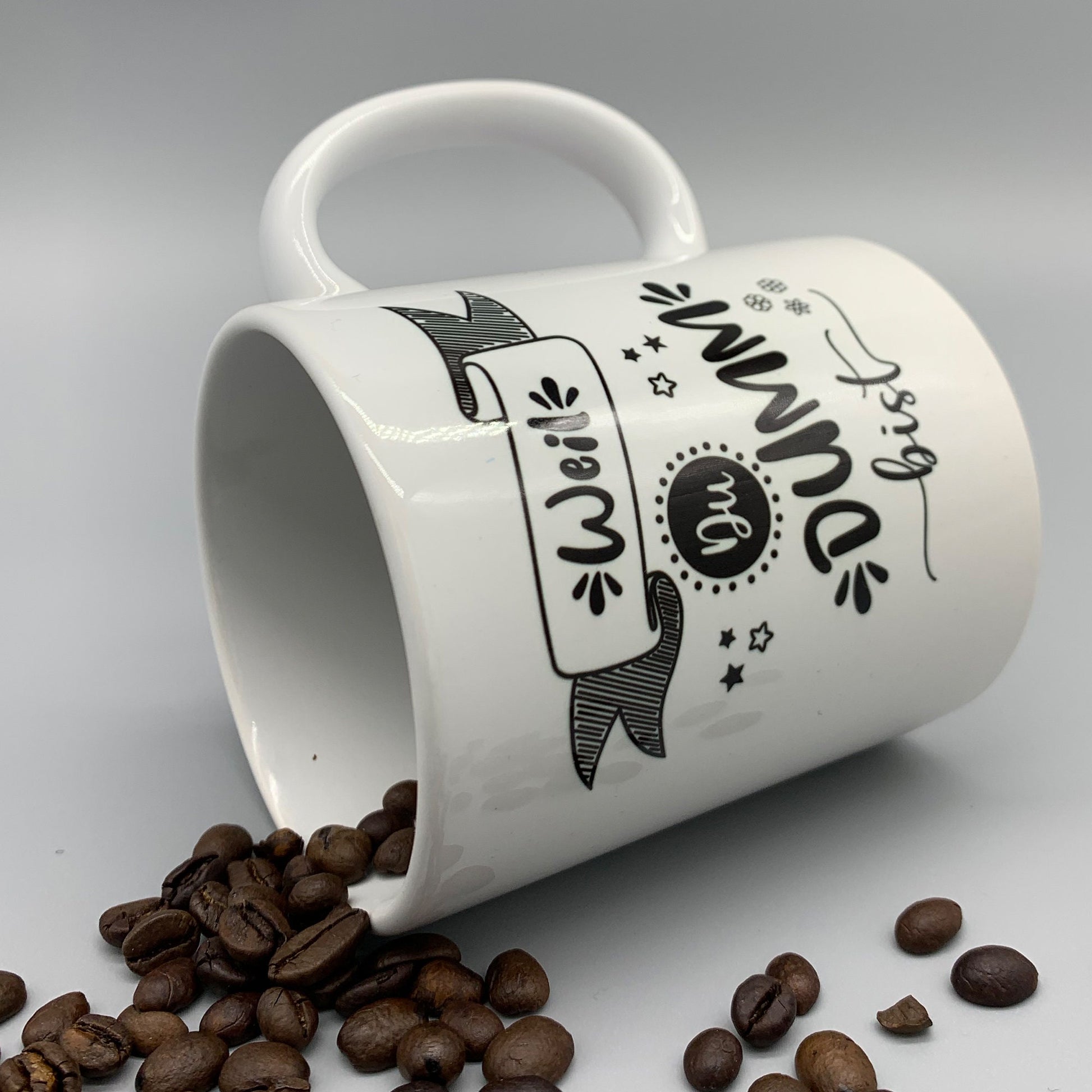 Weiße Tasse mit beidseitig, schwarzem Aufdruck "WEIL DU DUMM BIST"