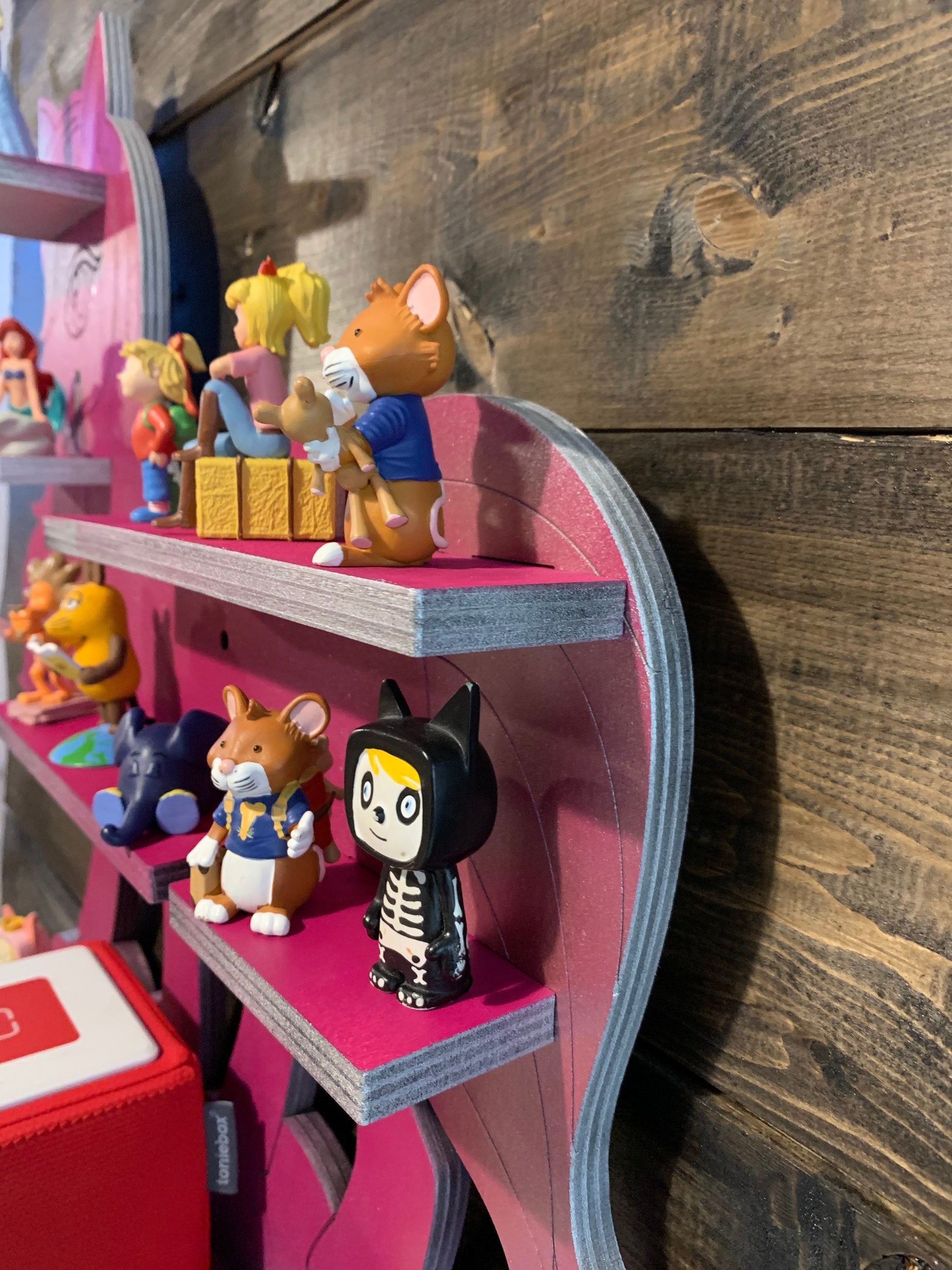 Das Regal bietet Platz für ca 20 Figuren. Die Holzplatten sind auf Wunsch mit 20 Stk. Magnete bestückt, so dass die Tonies darauf haften.